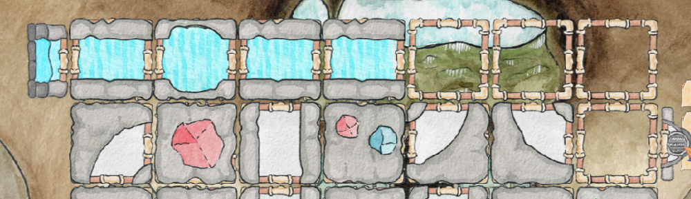 Die Felder wurden mit Aquarell-Farbe erstellt und mit Bildbearbeitung am PC angepasst für das Spiel. Hier sind einige der Tiles welche von der Quest verwendet werden. Je nachdem wo sich der Spieler in der Quest befindet, werden sie ein und ausgeblendet.