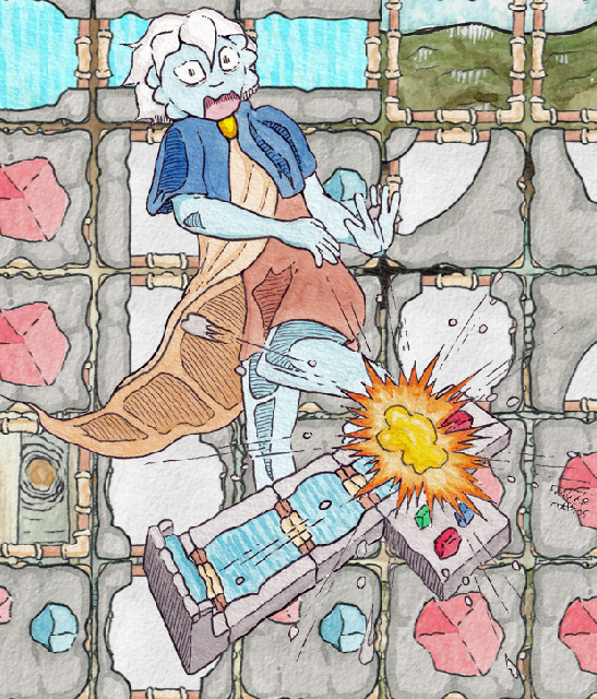 Meine Bilder werden wenn sie fertig sind, gescannt und mit einem Bildbearbeitungsprogramm überarbeitet, damit sie in einem Digitalen Spiel gut aussehen. Zur Linken sind die Original Assets auf Aquarelle-Papier, ich nutze für meine Kunst Aquarelle Farbe und Microns, also Marker für Line-Art.