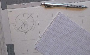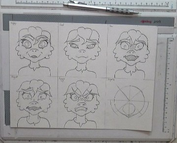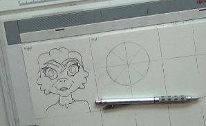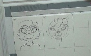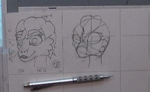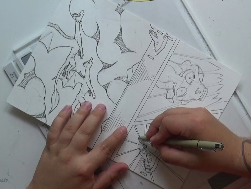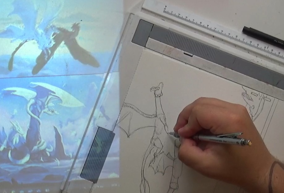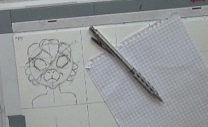 Dann überlege ich wo ich Charaktere und Objekte platziere, hier berücksichtige ich Pageflow und Items auf der letzten Page/Panel. Oft Thumbnaile ich auf dem Whiteboard und mit leichten Bleistiftstrichen vor um die Positionierung gut hin zu bekommen. Ich nutze hier einen kleinen Beamer um meine Referenz direkt neben mich auf den Tisch zu strahlen, so muss ich meinen Kopf nicht immer drehen .
