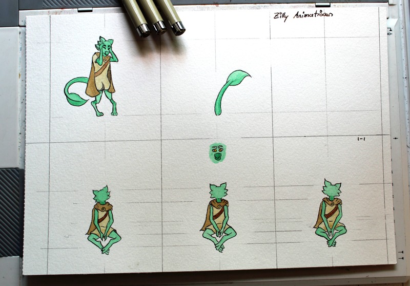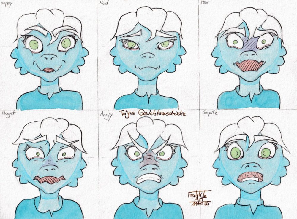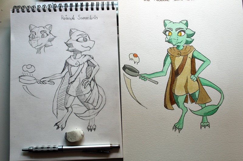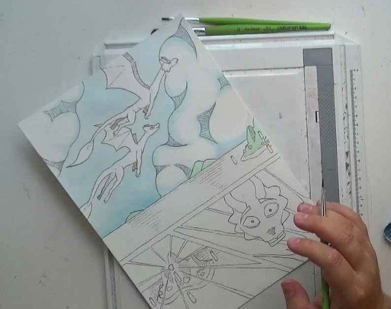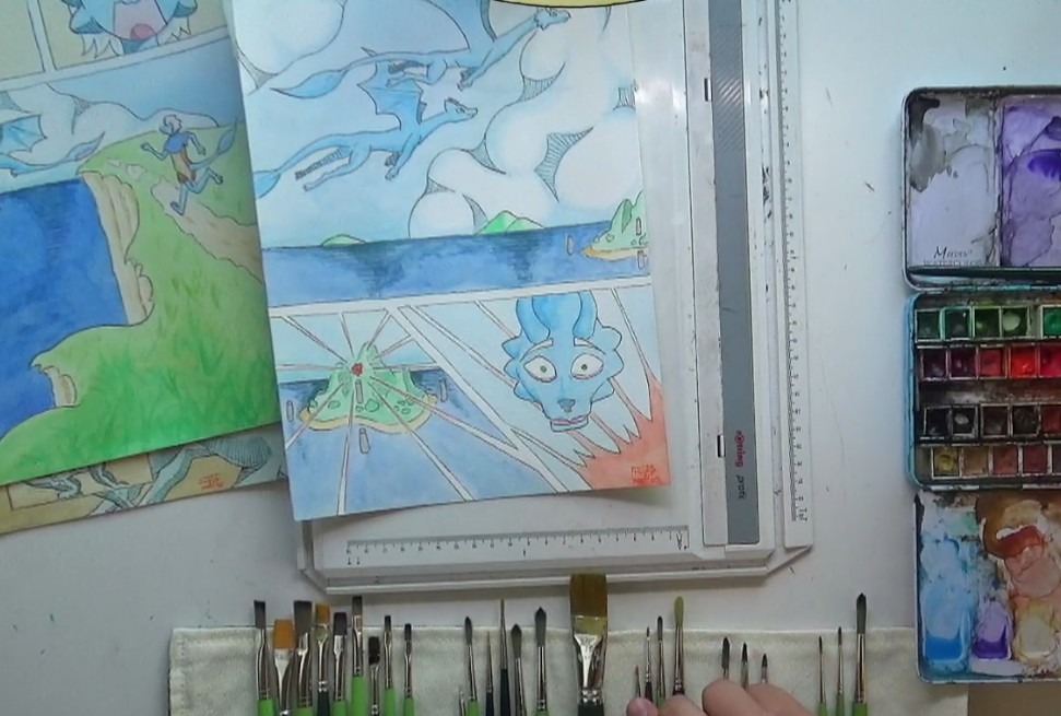 Jetzt kommt die Farbe drauf, ich nutze am liebsten Aquarell Farben, da ich gerne recht schnell arbeite. Hier habe ich meistens die vorherigen Panels parat, um zu sehen wie ich die Farben mische, damit diese möglichst gleich im Endergebnis aussehen. Sollte mit den Farben aber was nicht stimmen, kann ich diese auch in der Nachbearbeitung mit Bildbearbeitungsprogrammen nochmal überarbeiten.