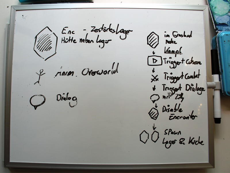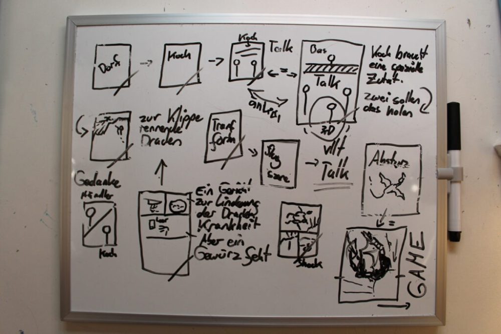 Ich habe in meinen Notizen eine Grobe Struktur wohin die Story geht in Key-Punkte der Story, aber für jeden neuen Story-Abschnitt erstelle ich eine Unterstruktur. Für jede neue Seite schaue ich mit die Letzten Seiten Seiten an uns übernehme Farben und Items in der Szene falls nötig. Hier kommt wieder das gute Whiteboard zum Einsatz.