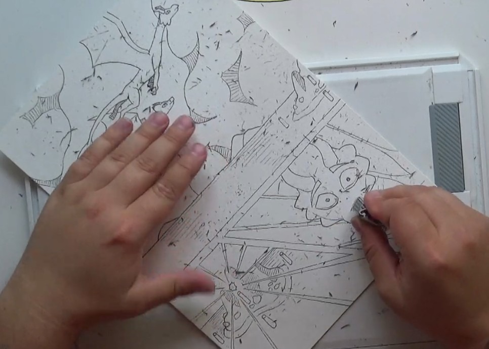 Sobald die Linien alle gezogen wurden, wird der Bleistift aus der ersten Phase wieder weggemacht für saubere Linien. Wenn ich einen Blick darauf habe wie das Bild ohne Bleistift aussieht, suche ich nach Fehlern, Lücken und schwachen Stellen und ziehe dort nochmal einige Linien nach.